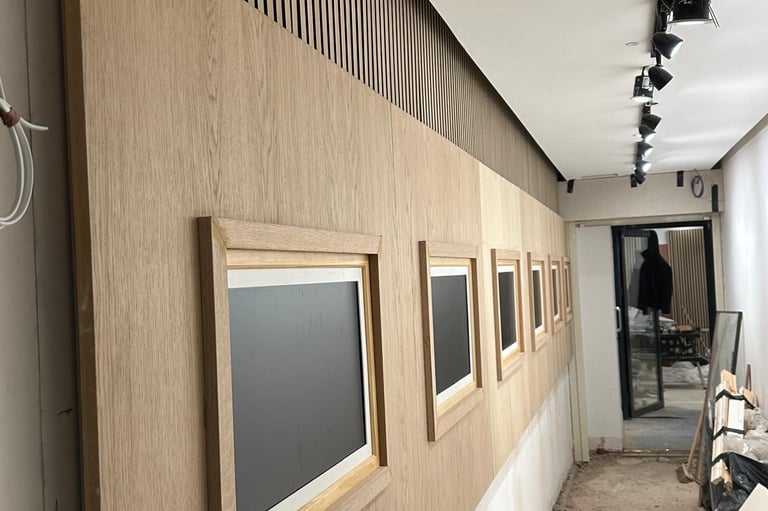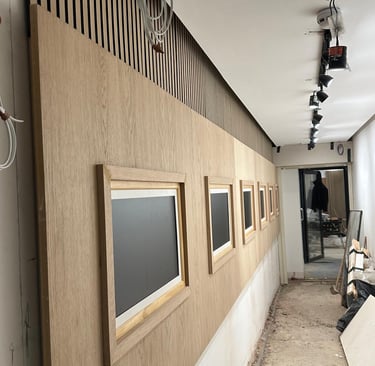 We installed bespoke wooden wall panels with decorative detailing and framed sections to accommodate integrated screens. The works combined practicality with refined finishes, creating a smart and functional feature wall that enhances both the look and use of the space.